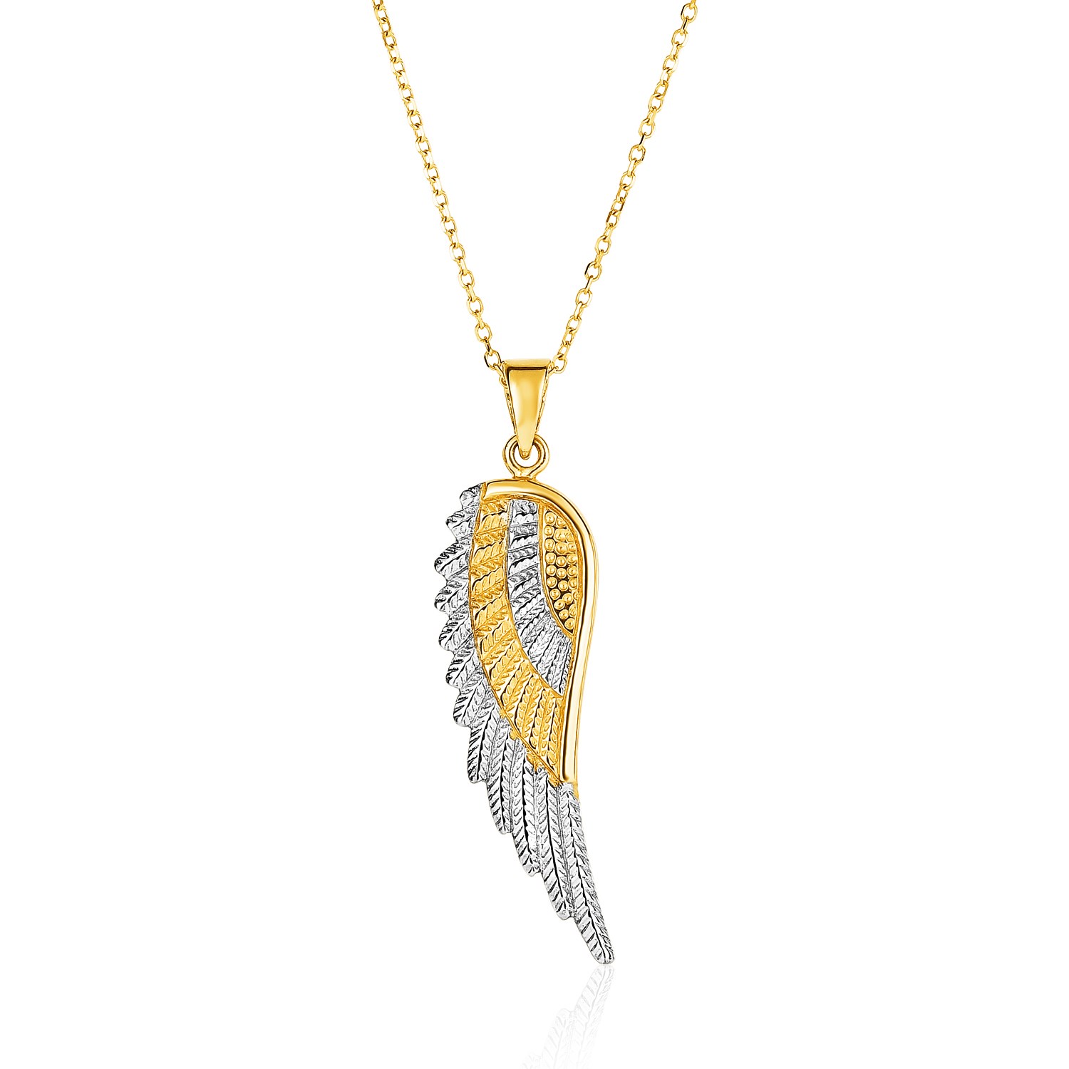 A beautiful and straightforward wing of an angel rendered in gold and white gold suspended from an elegant gold chain. The pendant is 18 inches long, 0.8 millimeters wide, and closes with a lobster clasp.