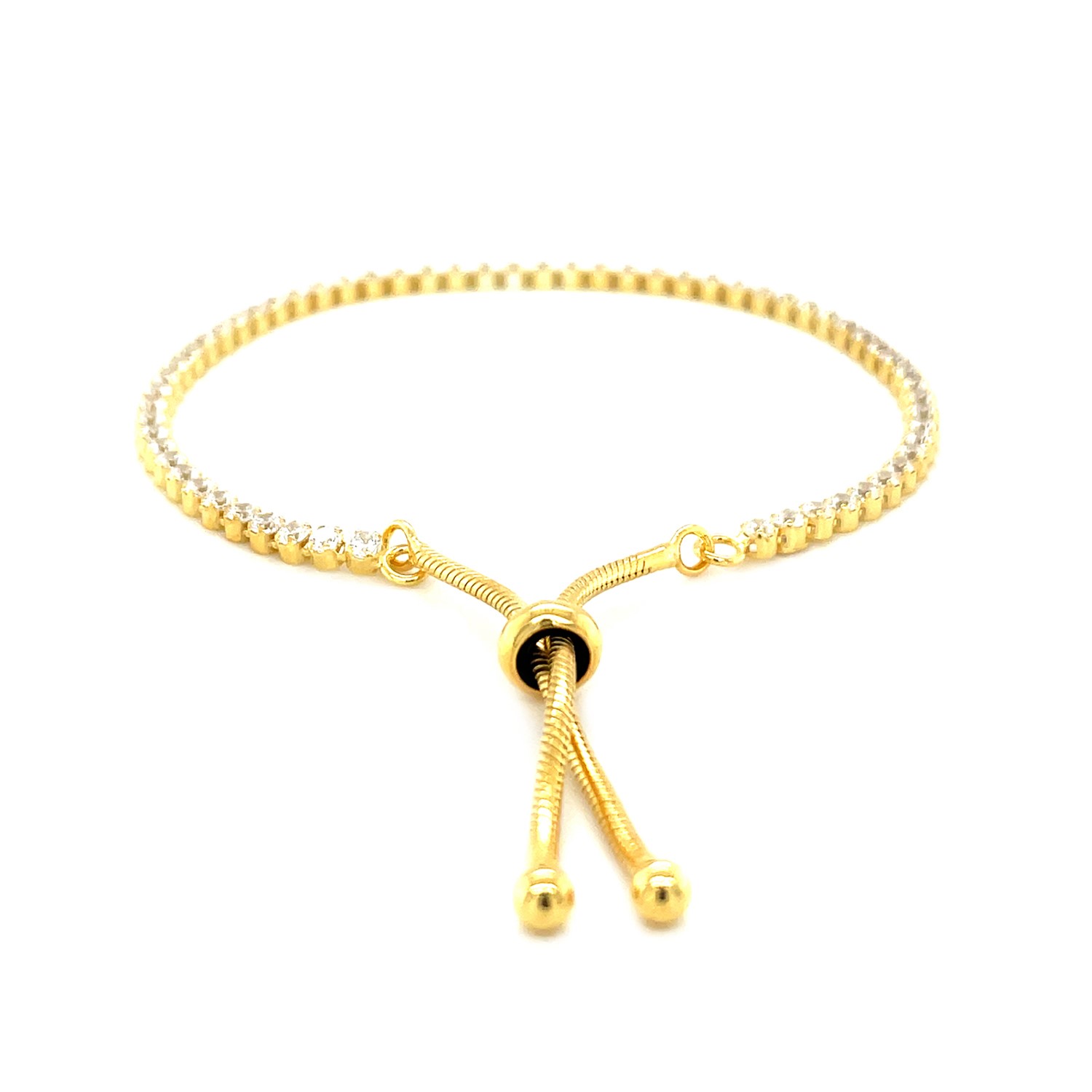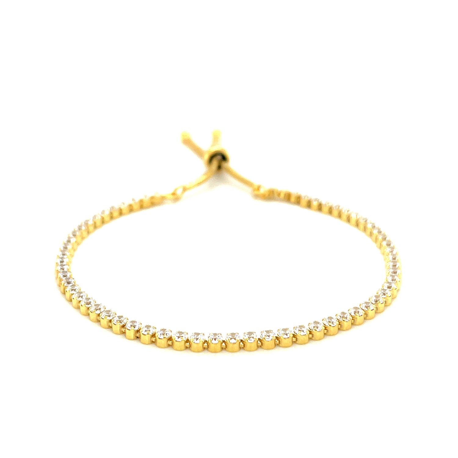This updated, adjustable version of a classic tennis bracelet features Cubic Zirconia in yellow-toned settings. Bracelet closes with a drawstring clasp.