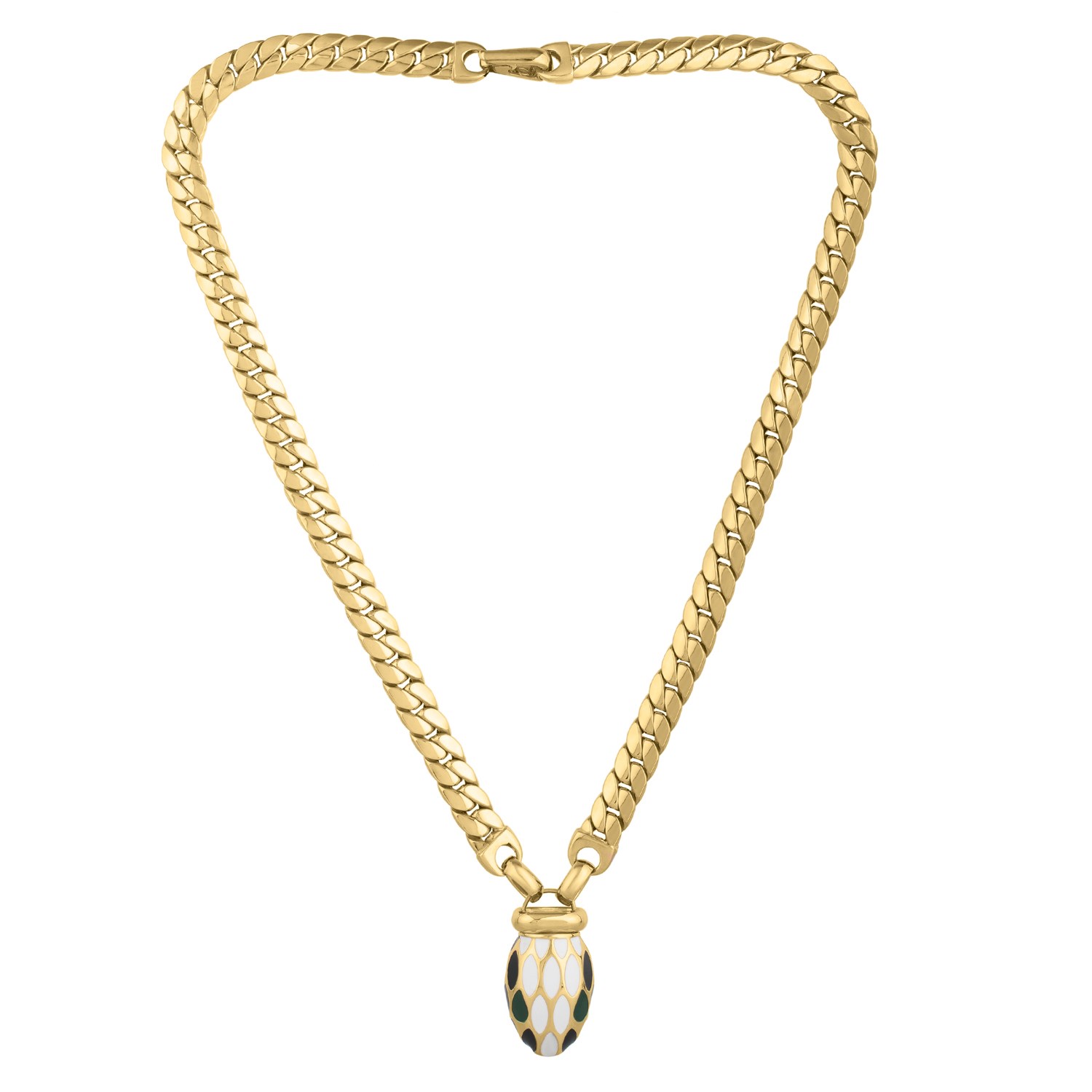 Bold and intriguing, this 14k yellow gold le serpent curb necklace captivates with its polished segments and serpentine-inspired design. A striking green and black enamel drop accent enhances the mystery of the motif, adding to its bold aesthetic. This piece embodies transformation and strength for those who appreciate symbolic jewelry while making a powerful style statement. Available in an 18 inches length.