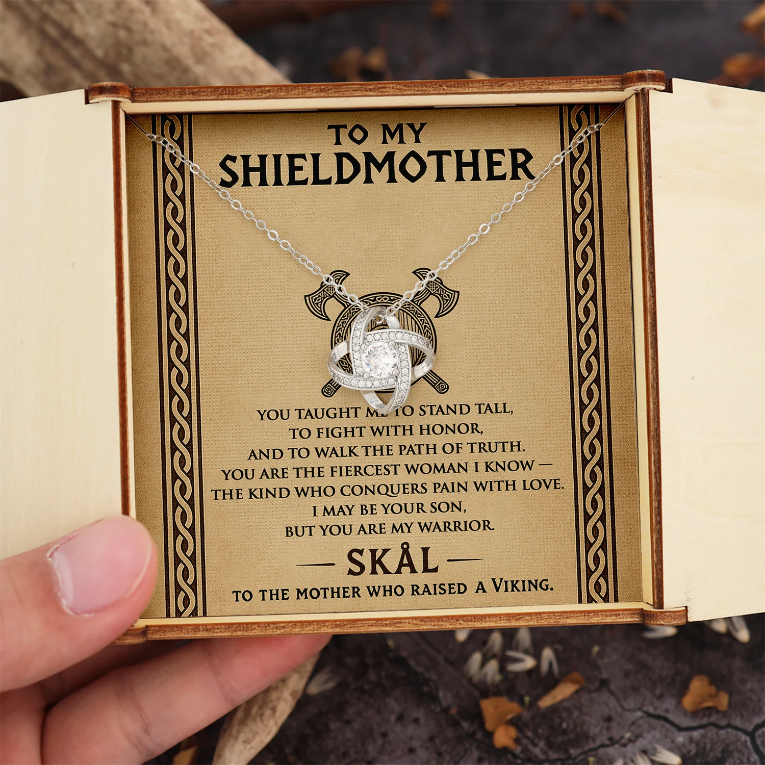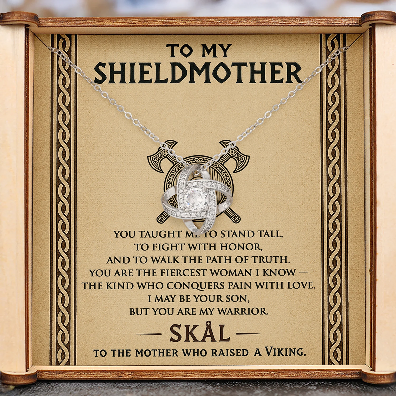 The Love Knot Necklace becomes a tribute to the bond between a Viking son and his shieldmother. Some call it fate, some call it destiny, others the strength of a warrior’s heart. This pendant honors the fierce woman who taught you to stand tall, fight with honor, and walk the true path in life.