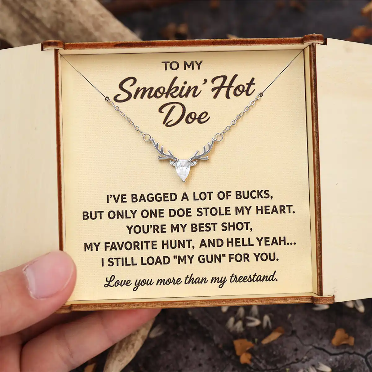 I gave this to my wife after a long weekend hunting trip. The moment she saw the wooden box with the deer design, she smiled and said, ‘This is so you.’ Then she read the card and started laughing — the kind of laugh where she shakes her head but can’t stop grinning. When she saw the necklace, she said it was the sweetest gift I’ve ever given her.