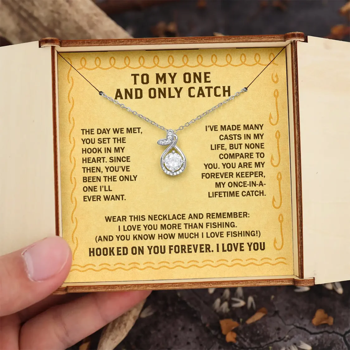 “To My One and Only Catch — The day we met, you set the hook in my heart. Since then, you’ve been the only one I’ll ever want. I’ve made many casts in my life, but none compare to you. You are my forever keeper, my once-in-a-lifetime catch. Wear this necklace and remember: I love you more than fishing. (And you know how much I love fishing!) Hooked on you forever. I love you.”