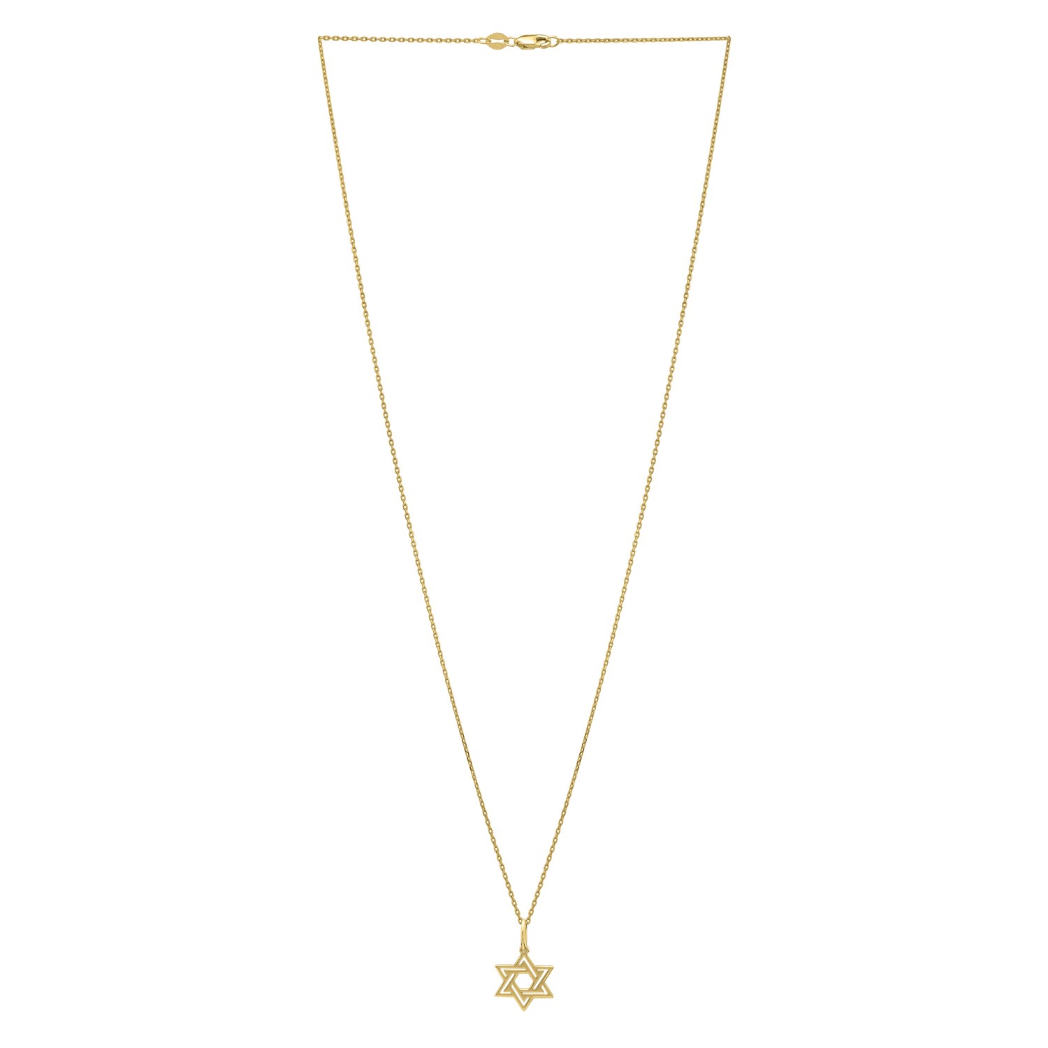 A finely detailed cut-out Star of David is the centerpiece of this 14k yellow gold necklace, showcasing the intricacy of its design. Paired with an 18 inches cable chain, the star pendant, combining tradition and artistry, serves as an expression of faith and heritage. Secured with a lobster clasp closure.