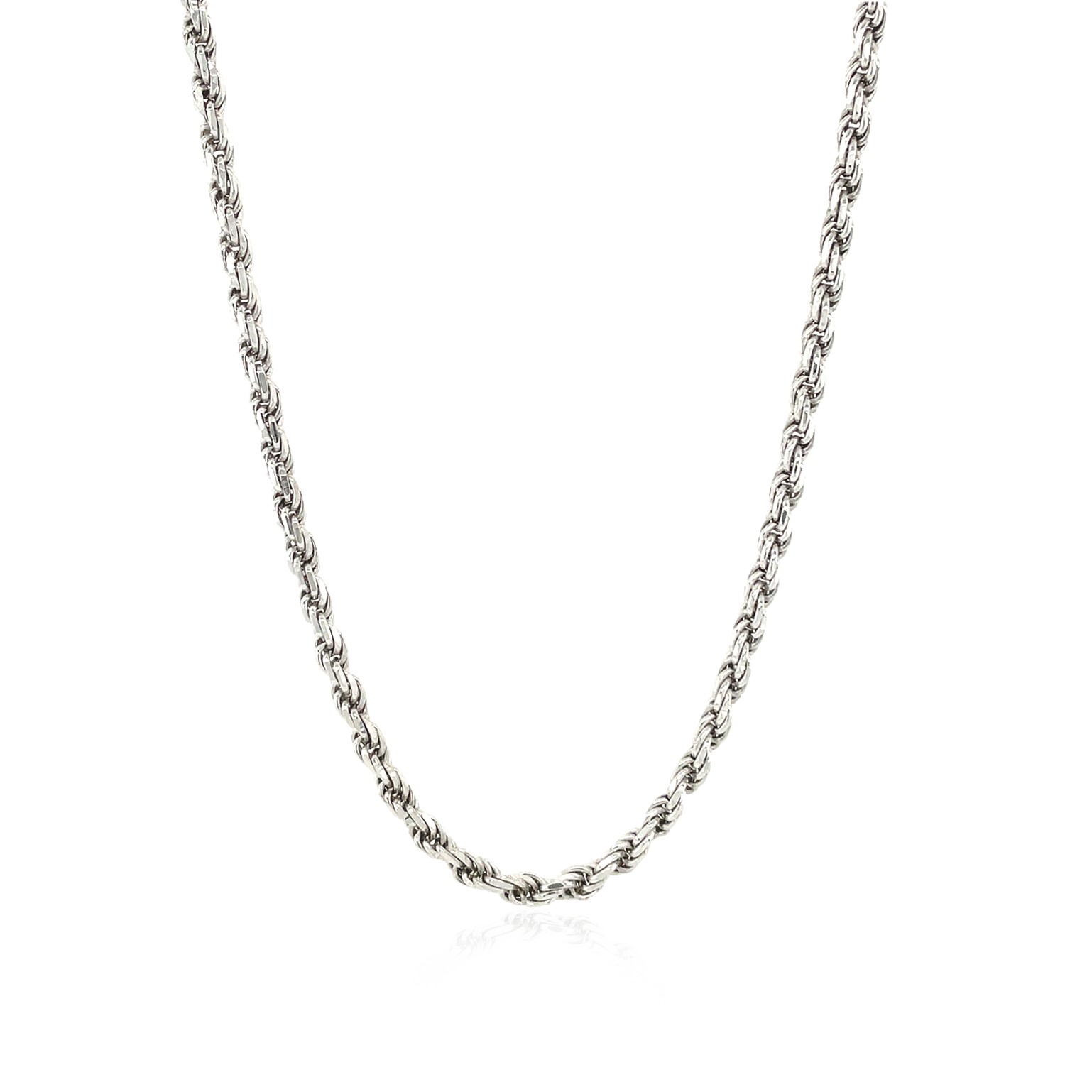 This classic chain is crafted in gleaming sterling silver with rhodium polish. Featuring a diamond cut rope type design, it has a width of 2.9 millimeters and is secured with a lobster clasp.