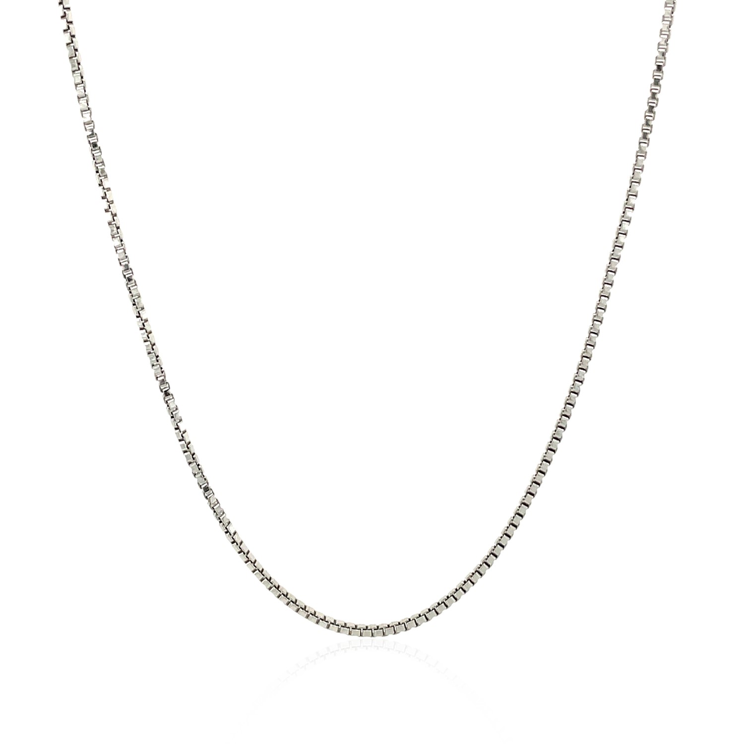 This rhodium-plated box chain comes in sterling silver and has a width of 1.10 millimeters.