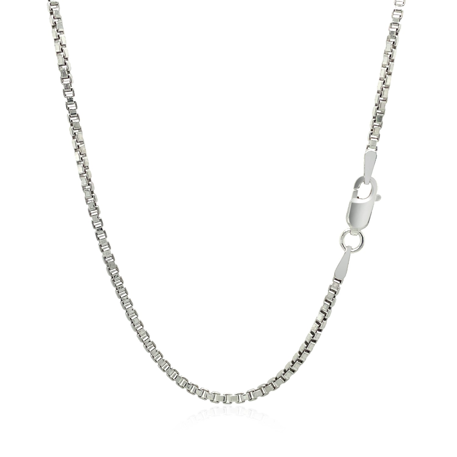 This rhodium-plated box chain comes in sterling silver and has a width of 1.8 millimeters.