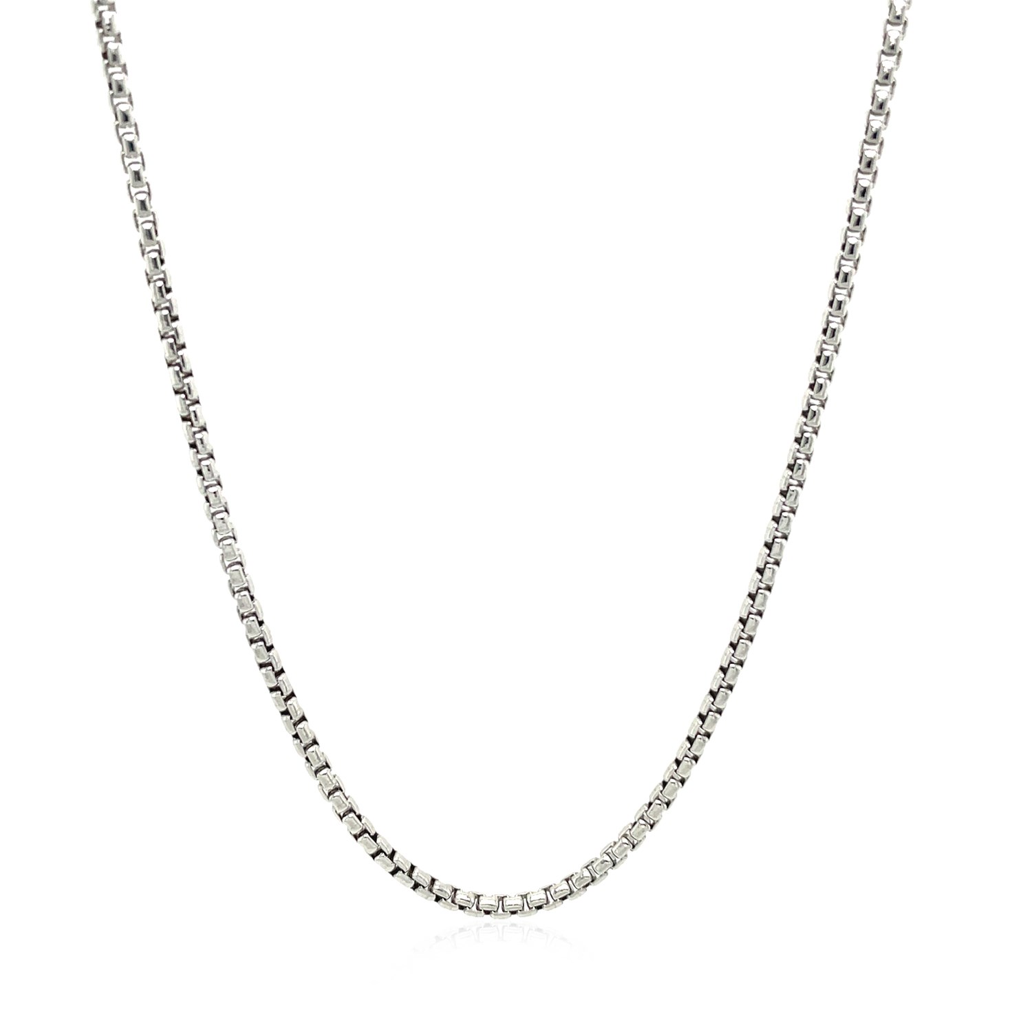 This rhodium-plated round box chain comes in sterling silver and has a width of 1.8 millimeters.