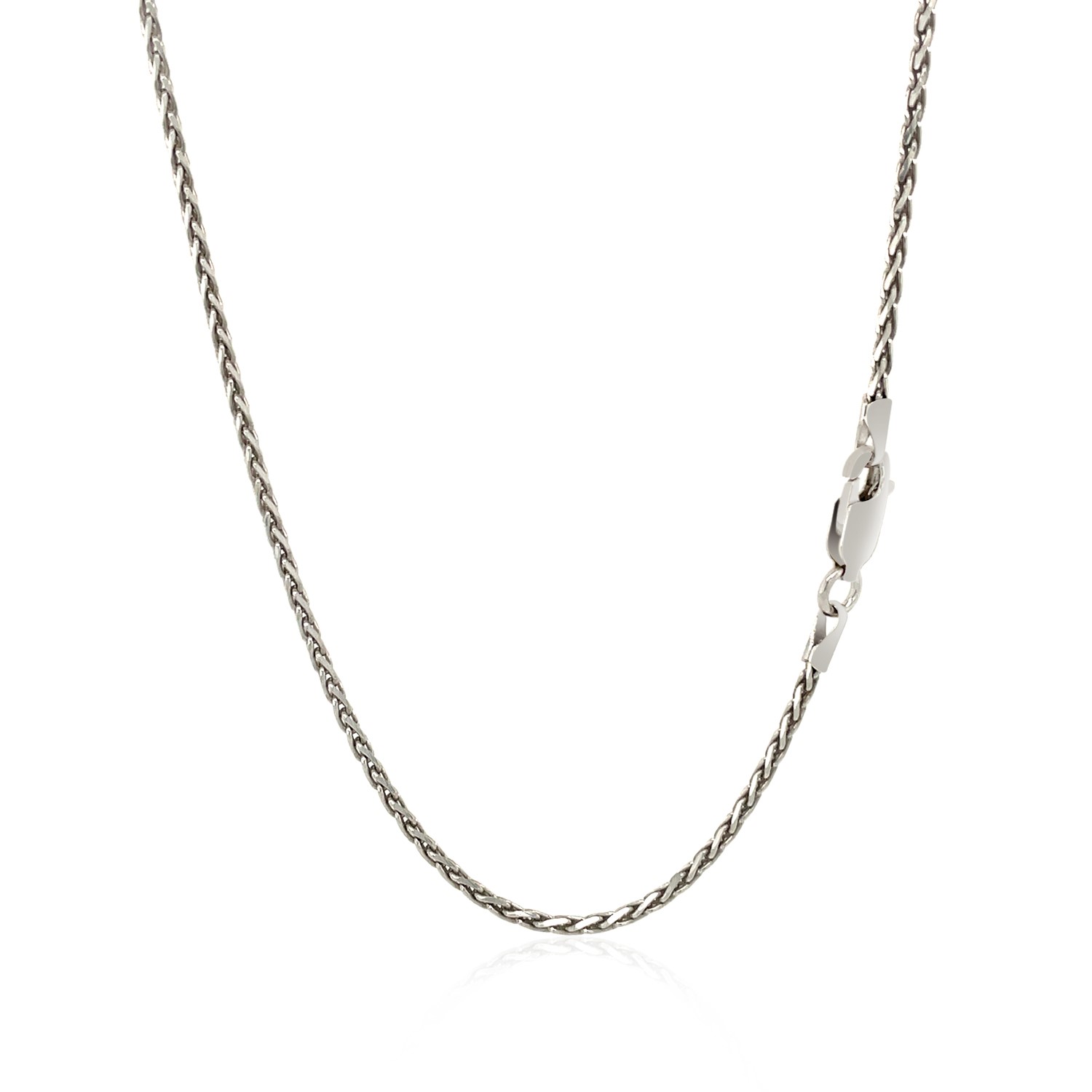 This rhodium-plated wheat chain comes in sterling silver and has a width of 1.5 millimeters.