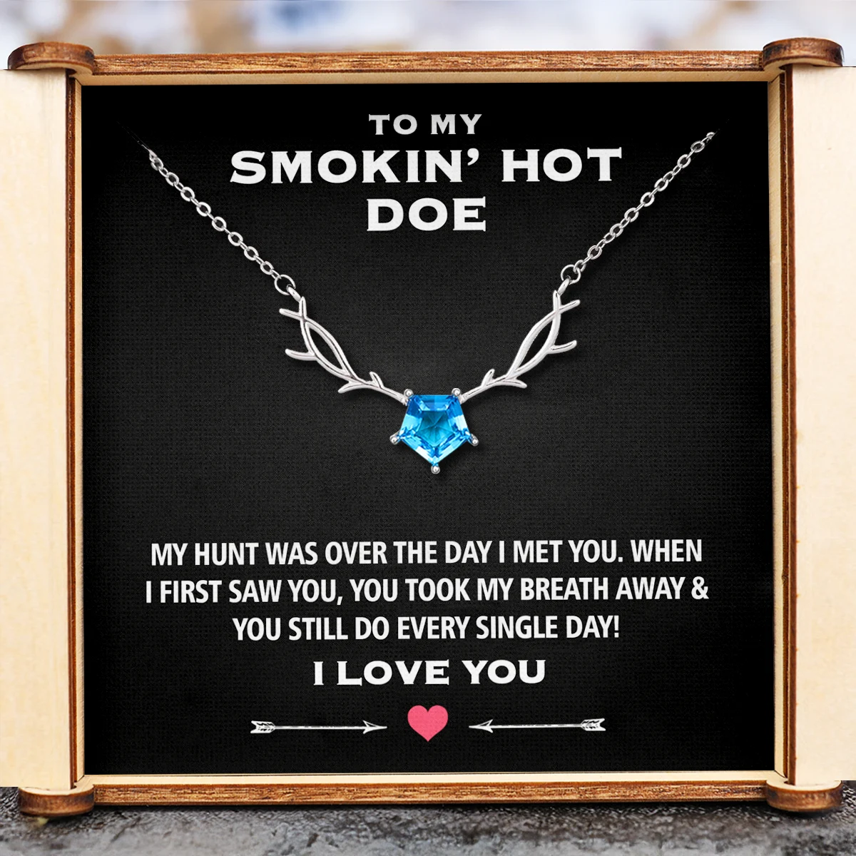 Give her a gift that captures your wild heart — romantic, rustic, and straight from the hunt. Inside this handcrafted Deer Wooden Box, she’ll find a stunning Blue Gem Necklace resting on a heartfelt message card that says it all: