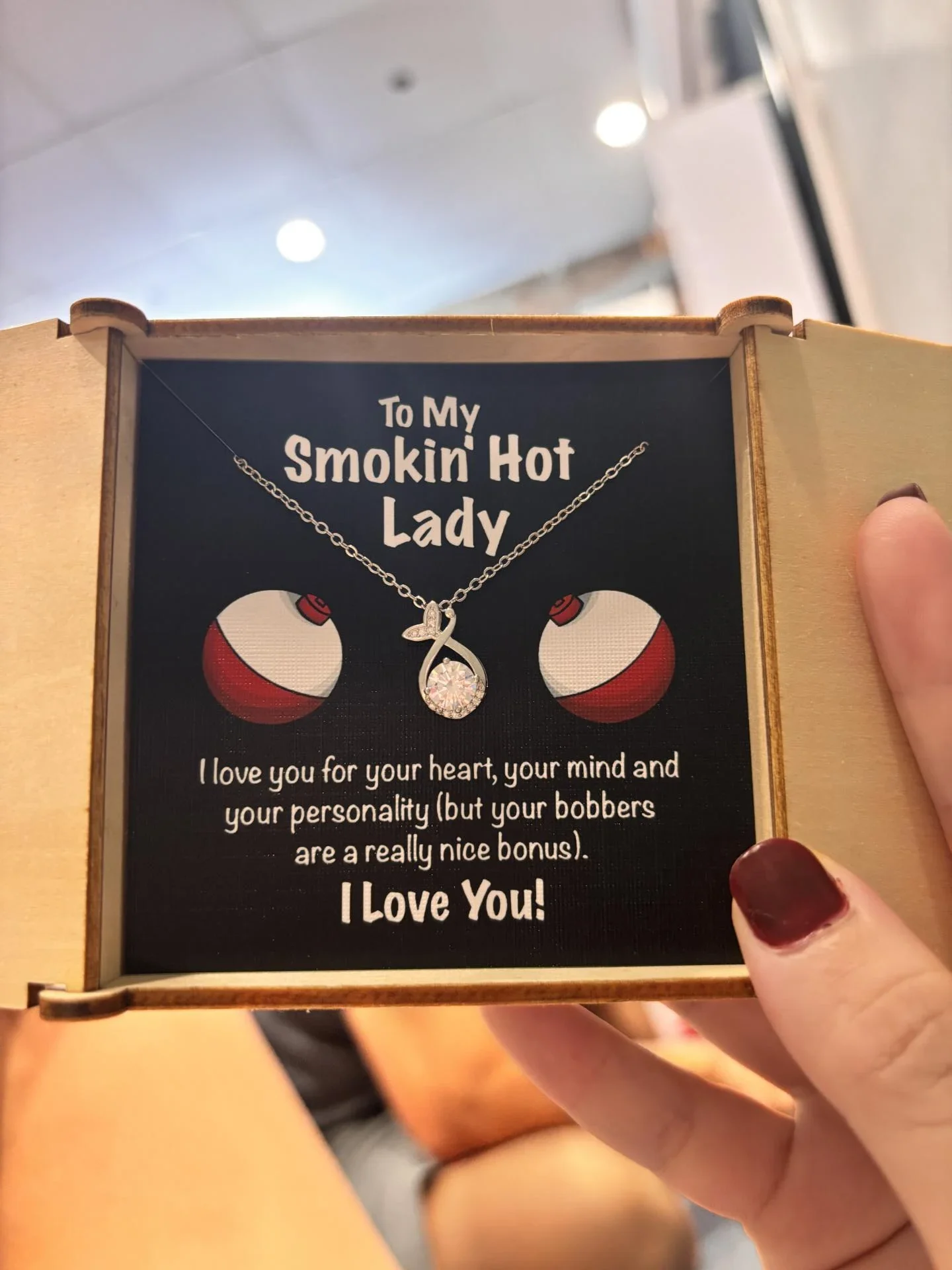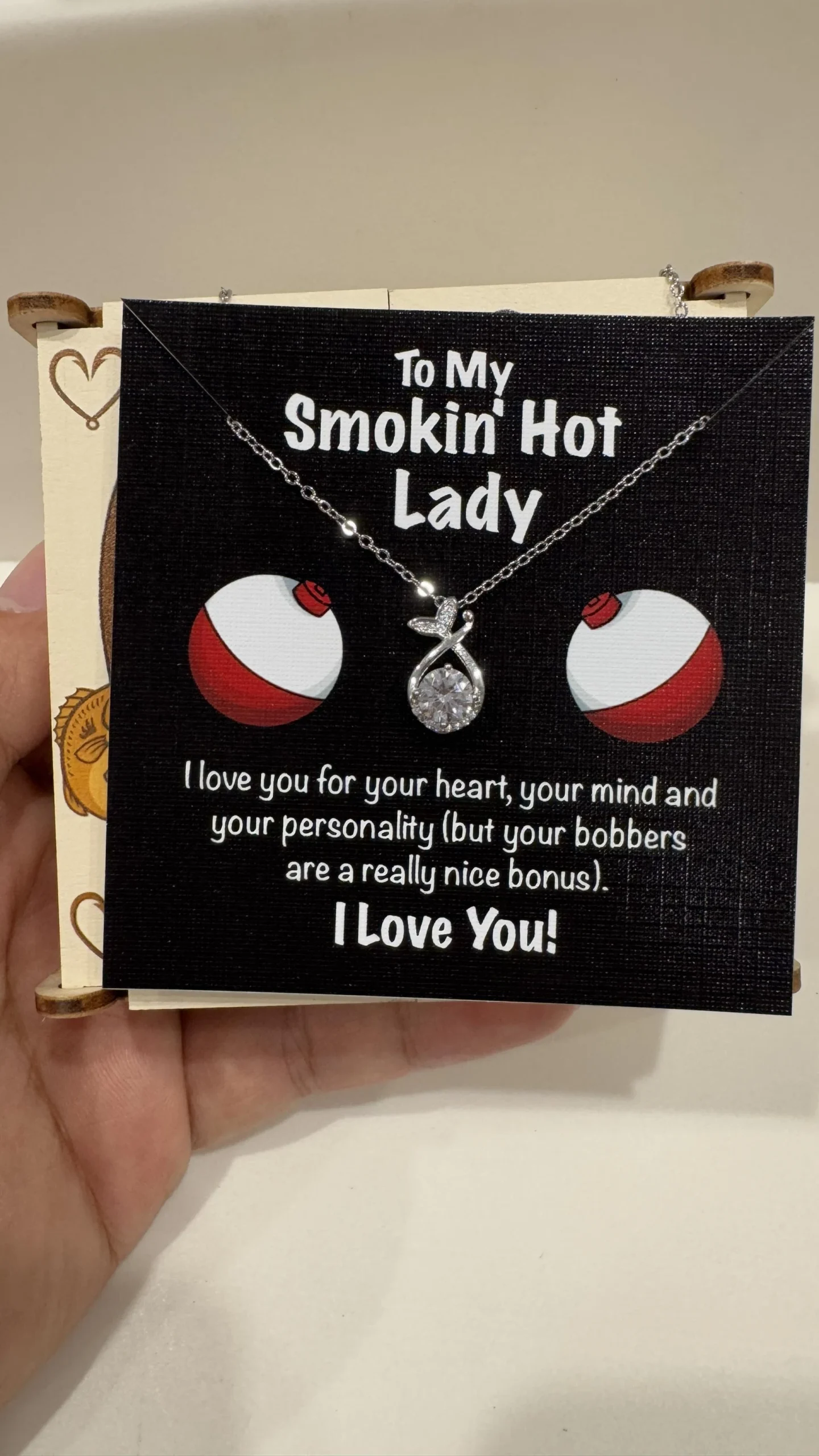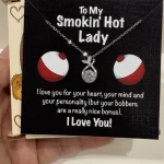 “To My Smokin’ Hot Lady. I love you for your heart, your mind and your personality (but your bobber are a really nice bonus). I Love You!“